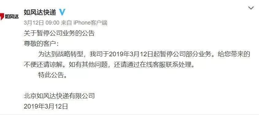 2019年3月,如风达公司宣布暂停公司部分业务,北京如风达快递有限公司的原控股股东橙联控股(厦门)有限公司已于2019年1月29日退出,通用物流电子商务(深圳)有限公司现持有如风达100%的股份。